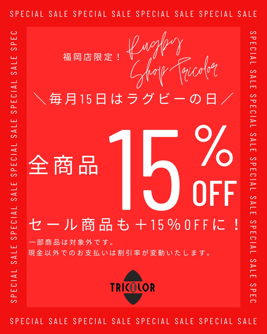 【実店舗】LINE会員様限定クリスマスクーポン配信予定のご案内!2025年12月14日【全店舗】年末年始 営業時間変更のご案内2025年12月16日 全部見る 2025年12月15日 カテゴリー お知らせ タグ 福岡店限定!毎月15日はラグビーの日です。 店内の全商品15%OFF(アウトレット品は表示割引率に+15%OFF)になります。 ご来店お待ちしております! ※現金以外でのお支払いは割引率が変動いたします。 ※一部商品は対象外です。 ※ご購入いただきました商品のお客様都合による返品交換は出来ません。 シェア0 関連記事2026年1月28日【実店舗】LINE会員様限定バレンタインクーポン配信のご案内!もっと詳しく2026年1月28日【全店舗】セプターボールキャンペーンのご案内!もっと詳しく2025年12月26日【実店舗】新春セール開催のご案内!もっと詳しく コメントを残す コメントをキャンセルメールアドレスが公開されることはありません。 ※ が付いている欄は必須項目ですコメント ※ 名前 ※ メール ※ サイト 次回のコメントで使用するためブラウザーに自分の名前、メールアドレス、サイトを保存する。