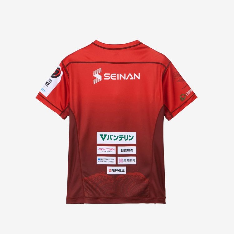 NTTジャパンラグビー リーグワン2025-26の日本製鉄釜石シーウェイブスの新1STレプリカジャージーです。ジャージーカラーの「赤」は、これまでの歴史に対する尊重を表現しており、ボディにあしらわれた波の柄は釜石ラグビーにとっての象徴である「富来旗(ふらいき)」の波を模したデザインとなっています。昨シーズン同様に「船出の帆」「羽ばたきの翼」をモチーフとした釜石鵜住居復興スタジアムの屋根幕を胸元に施し、地域のシンボルを目指していくというチームコンセプトを表現したデザインになっています。